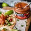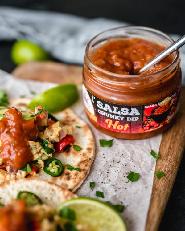 Poppamies Chunky Salsa Dip Hot – intensyviai aštrus, charakteringas salsa padažas, puikiai tinkantis prie nachos ar kaip ryškus akcentas įvairiems Tex-Mex patiekalams.