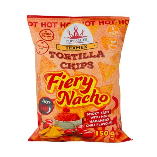 Poppamies Fiery Nacho tortilijų traškučiai – jau čia! Deginantis habanero pipirų aštrumas, ryškus dūmo aromatas ir traškūs tortilijų traškučiai susijungia į meistrišką skonio patirtį.