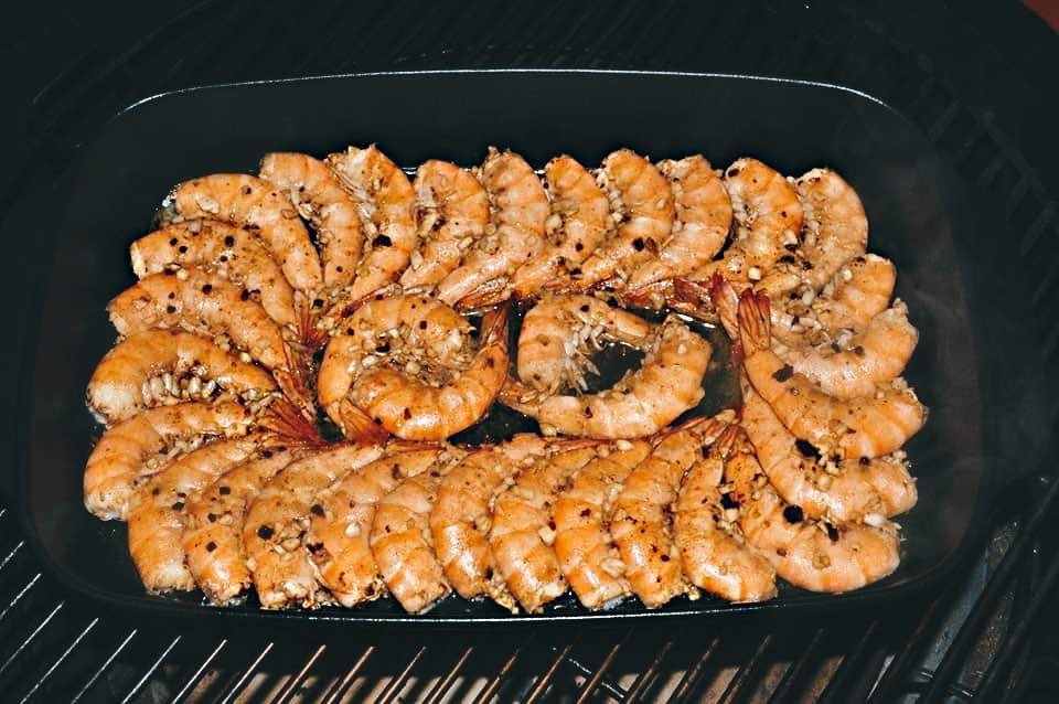- Gražiai išdėliokite krevetes keptuvėje. Kepkite 12- 15 min netiesioginėje kaitroje, 200°C temperatūroje. Vartyti nereikia.