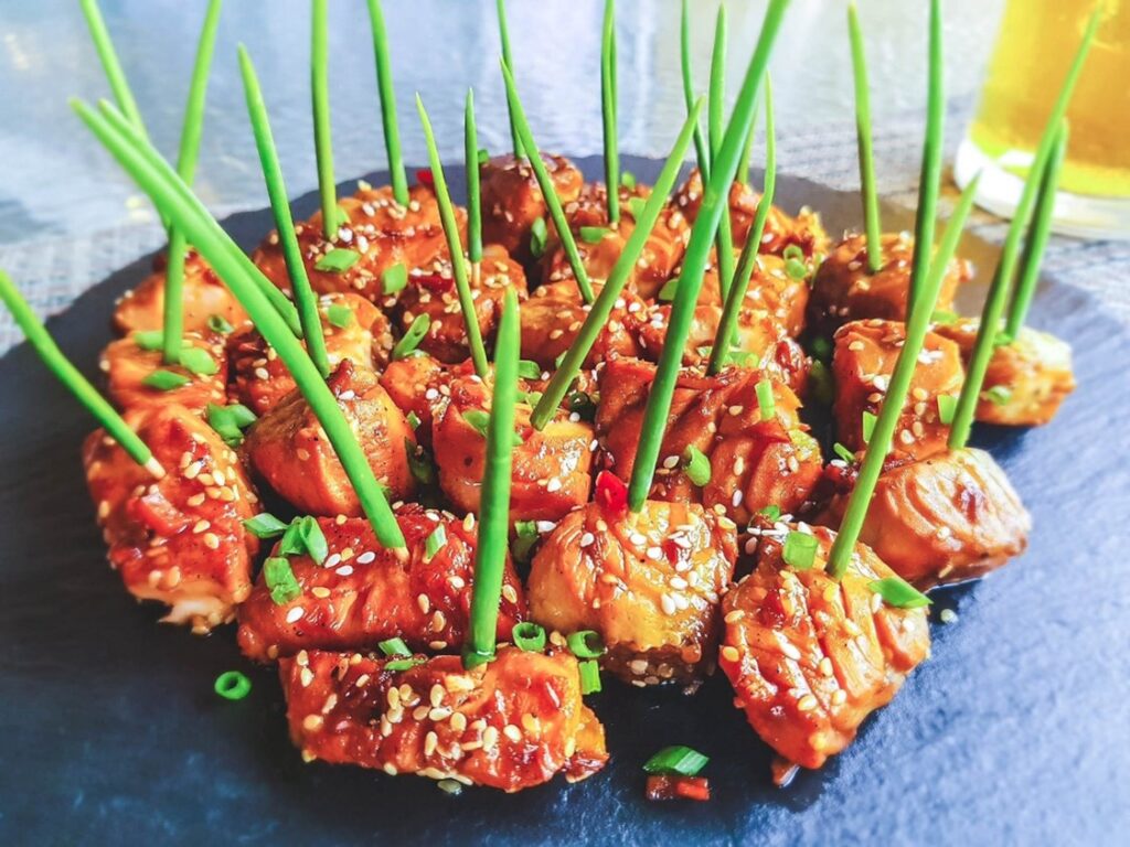 5. Išimkite lašišą (padažą palikite, ant žuvies nepilkite). Patiekite į kiekvieną gabaliuką įsmeigdami krapštukus paslėptus svogūnų laiškuose, užbarstydami sezamo sėklomis ir smulkiai pjaustytais svogūnų laiškais. Prieš valgant, leiskite truputį atvėsti.