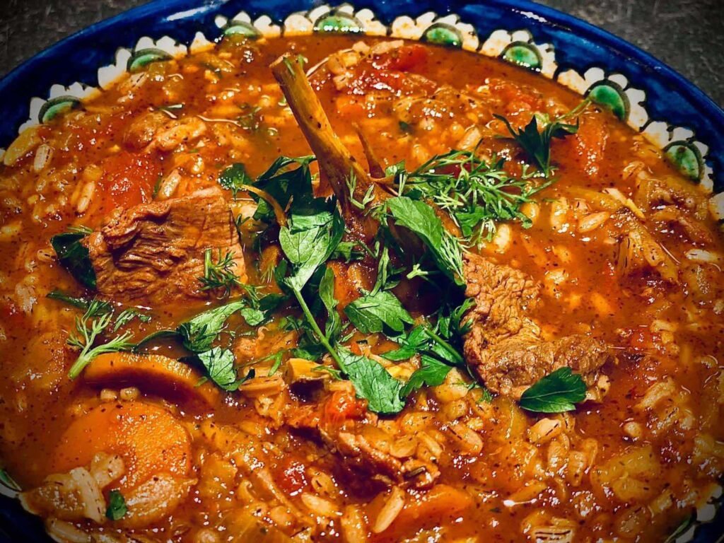 - Viską apkepę, išimkite ir į puodą sudėkite mėsą. Ją apskrudinkite, dėkite pomidorų pastą, gerai apdeginkite su tarkuotu imbieru. Tada ant viršaus sudėkite apkeptas daržoves, supilkite konservuotus pomidorus. Užpilkite viską verdančiu vandeniu, įmeskite čili ir česnako galvą. Uždenkite ir pavirkite 1 val.