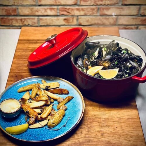 - Įspauskite kelias skilteles česnako ir patroškinkite, kol pasidarys rožinės spalvos. Supilkite grietinėlę, permaišykite, suberkite kapotas petražoles, pagardinkite druska, pipirais.