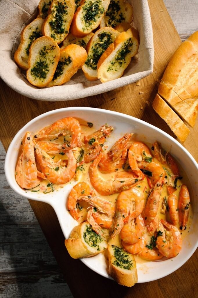 - Brusketas aptepkite prieskoniniu sviestu, kepkite ant grotelių, kol gražiai apskrus ir patiekite su krevetėmis.
