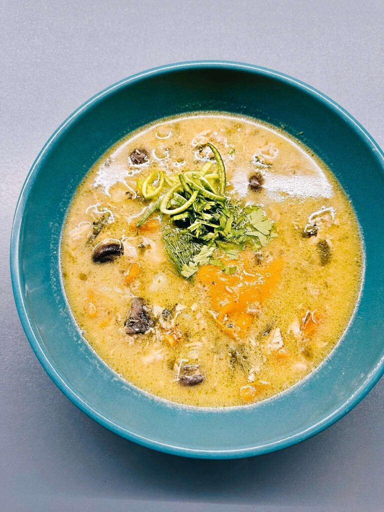 4. Patiekite su žalumynais ir pjaustytu poru.
