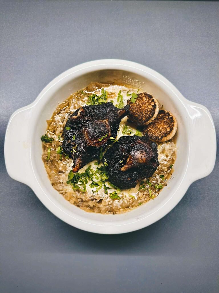 - Ant grotelių uždėkite ketaus puodą, įkaitinkite. Ant sviesto pakepinkite pjaustytus svogūnus, čili, pagardinkite druska ir pipirais, pilkite sausą vyną ir palaukite, kol nugaruos alkoholis (keleta minučių). Tada supilkite vištienos sultinį ir virkite apie 40-50 min.