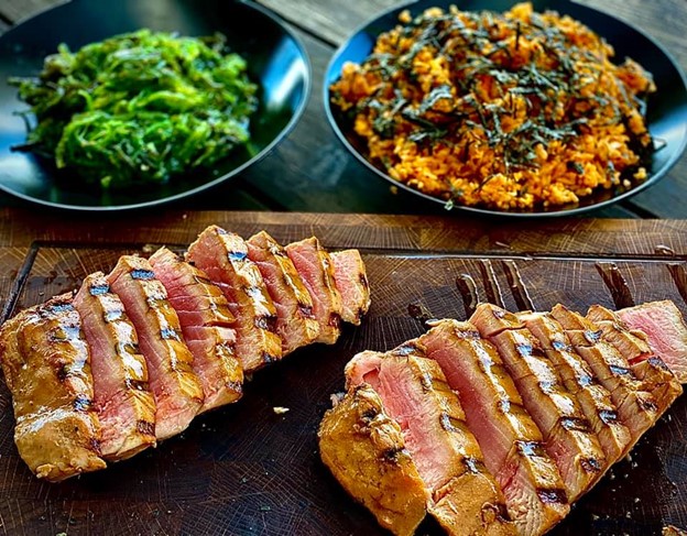- Kepkite po 2-3 minutes iš abiejų pusių arba kol vidinė tuno temperatūra pasieks 50C. Pamatuoti pagelbės maisto termometras.